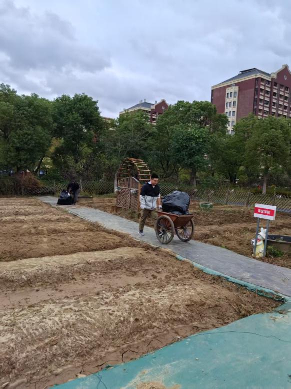 除草、松土、平整土地、清运垃圾……这些看似简单的农事劳作,却需要耐心、协作与汗水。有人俯身细致拔除杂草,践行着“一粥一饭,当思来处不易”的节俭美德;有人合力推动满载的小车,展现了“众人拾柴火焰高”的团结力量。汗水浸湿了衣背,但笑容却洋溢在脸庞。这不再是书本上抽象的概念,而是“纸上得来终觉浅,绝知此事要躬行”的真切体悟。同学们在协作中深化了友谊,在付出中感受到了集体的温暖,这正是志愿者精神与劳动实践完美结合的缩影。