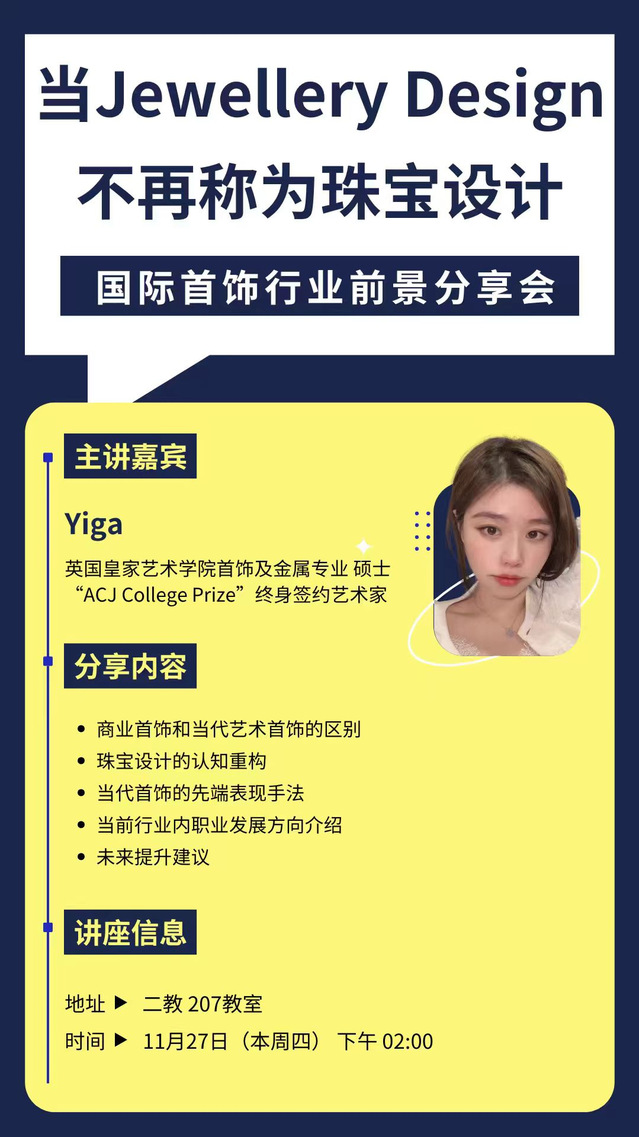 11月27日下午,上海建桥学院珠宝学院于二教207教室举办“当Jewellery Design不再称为珠宝设计”国际首饰行业前景分享会,特邀英国皇家艺术学院首饰及金属专业硕士、“ACJ College Prize”终身签约艺术家Yiga担任主讲嘉宾,学院宝石及材料工艺学专业学生到场参与交流。