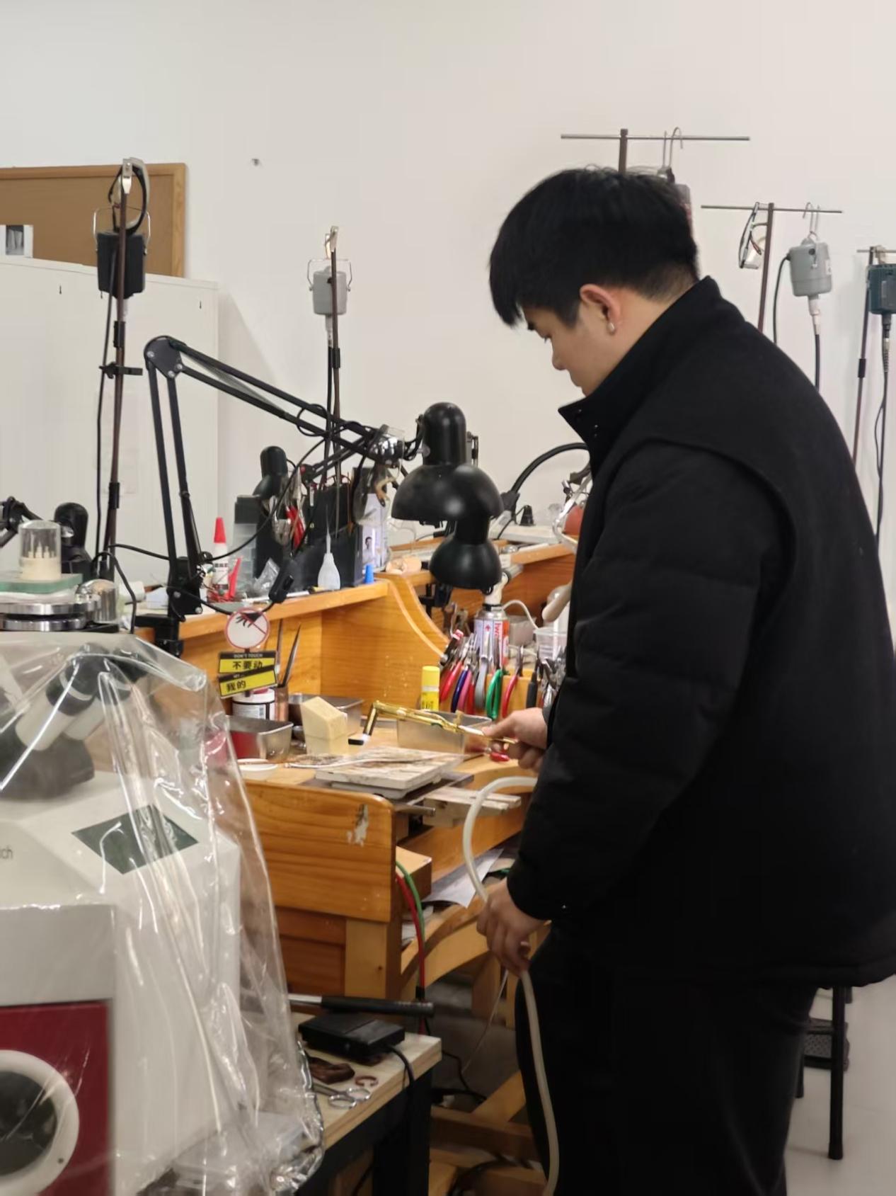 当天晚上,同学们乘车前往建桥珠宝艺术中心继续深度探访。在王潮老师的引导下,大家依次参观了常设展厅、校友作品精品廊、现代首饰设计工作室及工艺大师工作坊等区域。常设展厅陈列了从古典到当代的中外珠宝艺术精品,包括李正云的苗族花丝首饰和朱炳仁的铜艺作品等。在非遗錾刻展演区,同学们领略了传统工艺的独特魅力。王潮老师特别指出,所有展品均由学院师生团队独立完成,从研发到制作均体现“艺术与科技融合、学术与工艺并重”的人才培养理念。