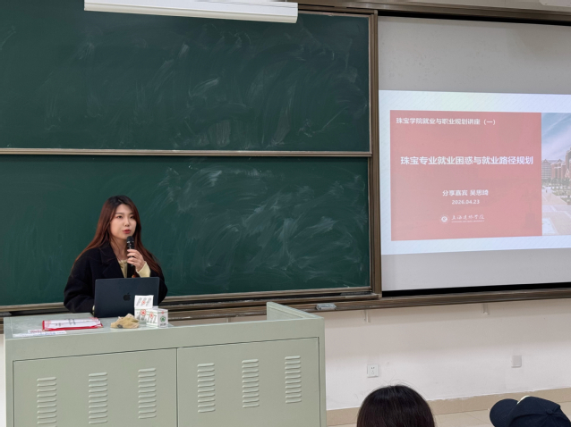 2026 年 4 月 23 日下午,上海建桥学院珠宝学院就业与职业规划专题讲座于第四教学楼 112 教室顺利开展。本次讲座由珠宝学院分团委书记董蕊老师主持,特邀行业资深从业者吴思琦老师莅临分享。出席本次活动的嘉宾还有:珠宝学院党总支书记王苇、华慧虹老师。讲座立足珠宝行业发展现状,聚焦毕业生求职痛点,旨在帮助同学们缓解就业焦虑、明确职业发展方向,全面提升青年学子就业竞争力与职业综合素养。